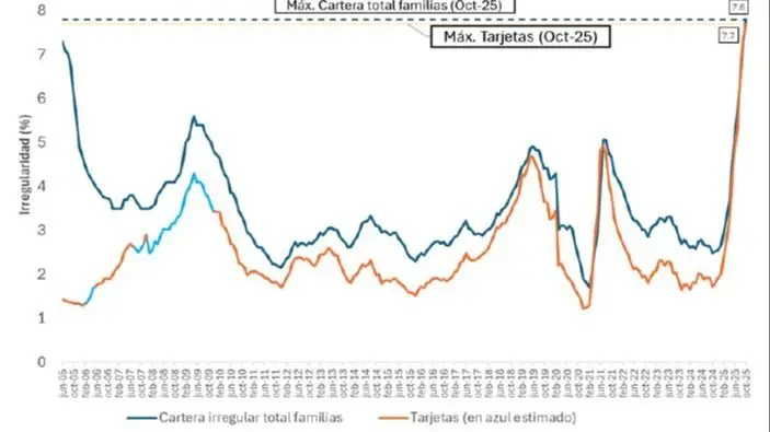 El endeudamiento de los hogares volvió a ocupar desde hace dos años un lugar central en la economía cotidiana. Los últimos datos del Banco Central, procesados por el área de Investigación de Provincia Microcréditos, muestran que la morosidad de las familias alcanzó en octubre de 2025 el 7,8%. Se trata del nivel más alto de irregularidad en los últimos veinte años, con doce meses consecutivos de crecimiento y una velocidad que remite a momentos de crisis profundas. Pero lo más doloroso es que en los jóvenes de entre 18 y 21 años, que en muchos casos se endeudan para estudiar o ayudar a sus familias, la morosidad alcanza el 41 por ciento.