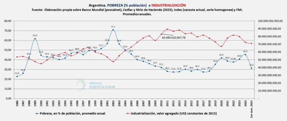 Considerando tal estado de situación, un centro de estudios analizó el vínculo entre la situación de la industria y sus fuentes de trabajo, con la evolución de la pobreza y concluyó que “la pobreza en términos estructurales ha tenido un recorrido relacionado con el al empleo industrial” al punto de que “el único momento en el que coincide una baja de la pobreza con una caída de la industria es a la salida de la hiperinflación”, según consigno un estudio del Instituto Argentino Grande (IAG).