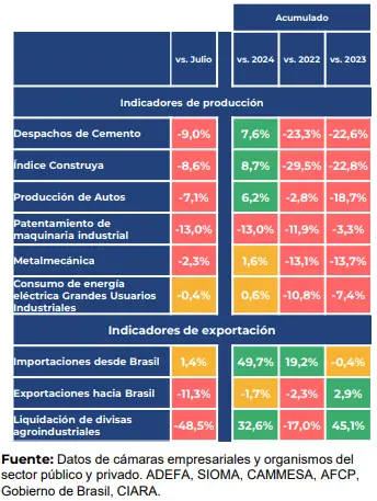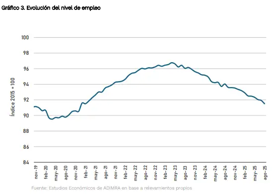 La situación estaría lejos de mejorar en los próximos meses. Tras la contracción de la producción industrial en jul/25 (-2,3% mensual y -1,1% interanual), datos anticipados para agosto (la cifra oficial se conocerá recién el próximo 8 de octubre) indican que se prevé una baja en torno al 3% en términos interanuales y un estancamiento mensual. De esa manera, “el sector ya acumula una merma promedio del 10% en lo que va del año comparado contra 2022 y 2023”, advirtió el Centro de Estudios (CEU) de la Unión Industrial Argentina (UIA). Es decir que, más allá del bajo nivel de comparación del 2024, el sector se encuentra por debajo de, al menos, los últimos 4 años.