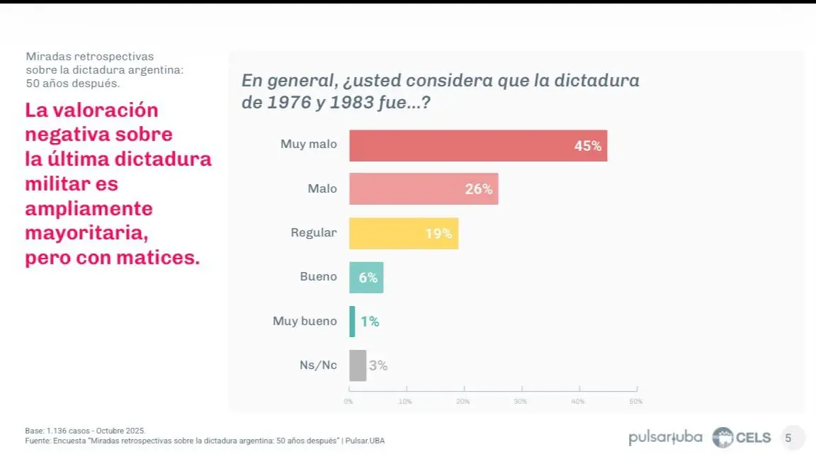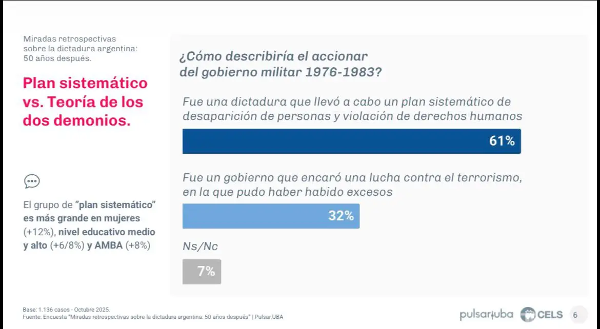 “Para la mayor parte de la población, el período se explica principalmente como un plan sistemático de desaparición de personas y violaciones a los derechos humanos (61%)”, dice el estudio “Miradas retrospectivas sobre la dictadura argentina: 50 años después”, elaborado a partir de una encuesta realizada en octubre de 2025, sobre una muestra de 1136 casos en todo el país. “Sin embargo -se advierte-, un 32% interpreta al gobierno militar como ‘una lucha contra el terrorismo en la que pudo haber excesos’, lo que muestra que, si bien existe un consenso condenatorio claro, persisten zonas de ambigüedad en la interpretación del período.”