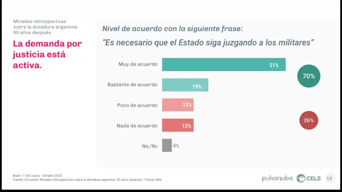 El estudio muestra que las políticas de memoria, verdad y justicia funcionaron. La mayoría de los encuestados dice haberse informado sobre la dictadura en la escuela, la universidad o en conversaciones familiares. “Otro de los hallazgos más relevantes es que, medio siglo después, el lenguaje de los derechos humanos sigue estructurando la manera en que la sociedad argentina nombra y comprende la dictadura. Las categorías de “desaparición”, “represión”, “violación de derechos” y “plan sistemático” forman parte del sentido común democrático, dice el estudio de la UBA y el CELS. Otro dato fuerte: siete de cada diez consultados se manifestaron de acuerdo con que el Estado siga juzgando a los militares.