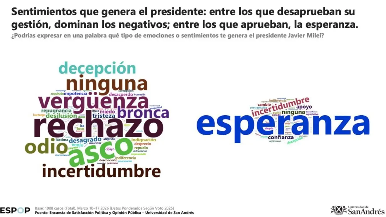 El último discurso presidencial ante el Congreso, el 1 de marzo, tuvo una recepción mayoritariamente negativa (52%). Las emociones y sentimientos que genera Javier Milei entre quienes aprueban al gobierno son la esperanza, la incertidumbre y la confianza, mientras que entre quienes lo desaprueban predominan el rechazo, la vergüenza y, nuevamente, la incertidumbre.