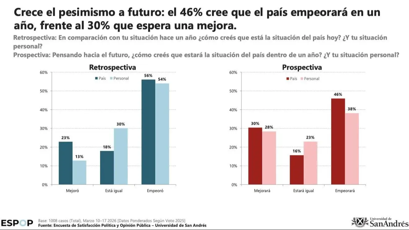 Los bajos salarios (37%) y la falta de trabajo (36%) se consolidan como los principales problemas del país, superando incluso a la corrupción (33%). La inflación (20%) ha perdido centralidad relativa en la agenda de preocupaciones. En términos de evolución, la falta de trabajo muestra el mayor aumento (+6 puntos porcentuales), seguida por la inflación (+5 puntos). En consonancia, crece el sentimiento negativo sobre el futuro. El 46% de los argentinos cree que el país empeorará en el próximo año, frente a un 30% que aún espera una mejora. Este dato llevó a los investigadores a señalar que «el crédito social empieza a ajustarse ante la persistencia de los problemas económicos, especialmente el empleo y el salario».