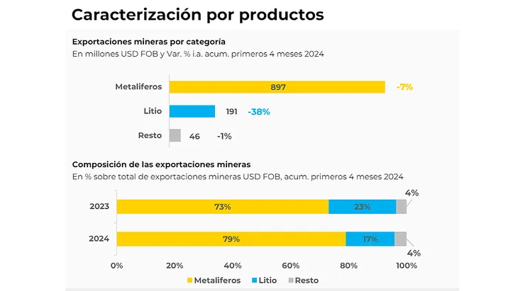 Las ventas a estos cuatro países estuvieron dominadas por los minerales metalíferos, que constituyeron el 82% del total de las exportaciones tanto en abril como en los primeros cuatro meses de 2024.