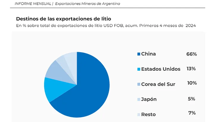 El gran comprado de litio, con inversiones en más de 50% de los proyectos argentinos, fue China, que incrementó su participación en las exportaciones de litio un 138% frente a los primeros cuatro meses de 2023.