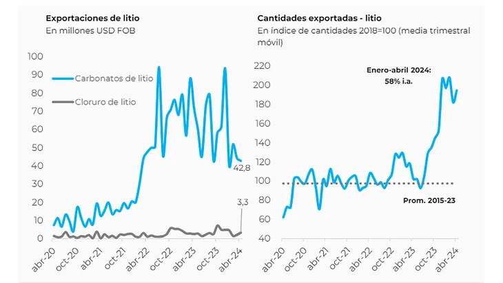 Para el caso del litio, en abril se exportaron un total de u$s46 millones, lo que implicó una caída interanual en los montos exportados de 37,7%, principalmente por el abrupto descenso de los precios: la tonelada de litio equivalente se desplomó en los primeros meses del año de los u$s84.000 a unos u$s15.000 en promedio.