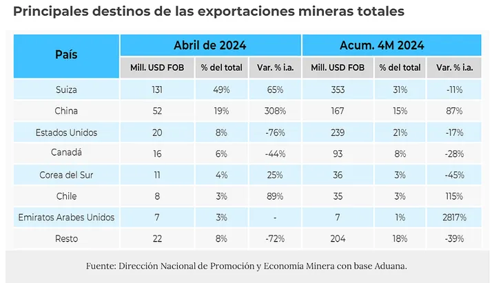 Suiza, China, Estados Unidos y Canadá fueron los principales destinos de las exportaciones mineras en abril, absorbiendo el 82% (u$s219 millones) de las ventas totales. En el acumulado anual, estos países representaron el 75% (u$s852 millones) de las exportaciones.