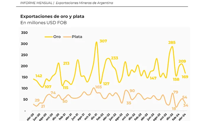 De esta manera, en los primeros 4 meses de 2024 el oro muestra un crecimiento interanual del 6,3% en los montos exportados, mientras que la plata cayó un 44,7% interanual.