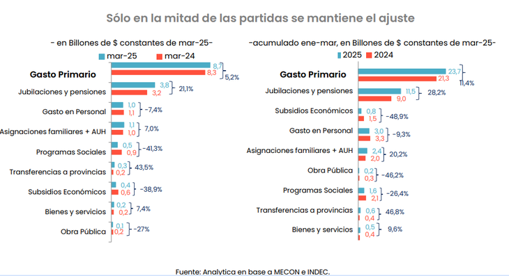 En cambio, el recorte de gastos persiste en programas sociales con el 26,4%; la obra pública, con el 46,2% y los subsidios económicos con el 48,9%.