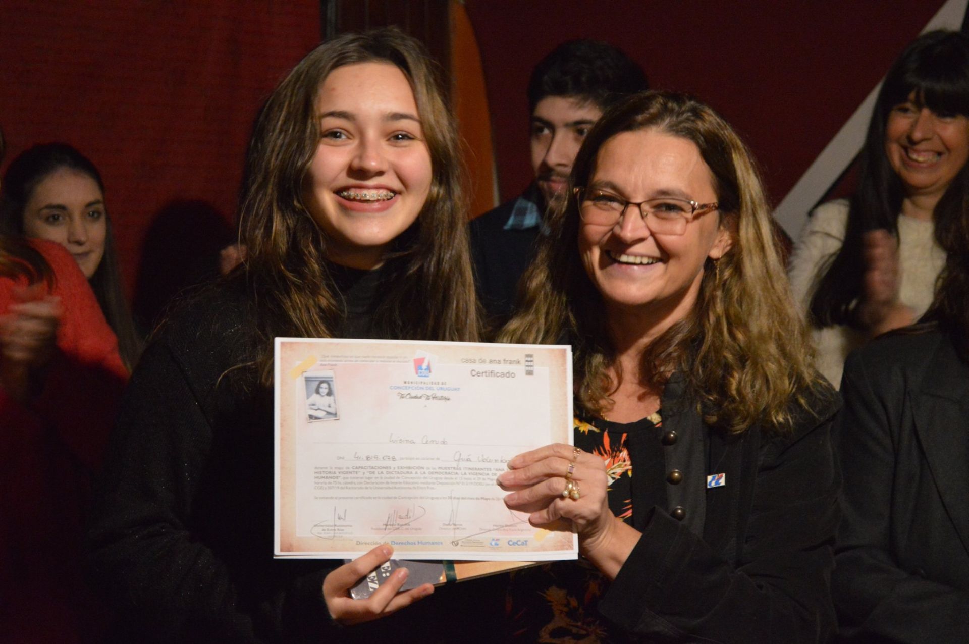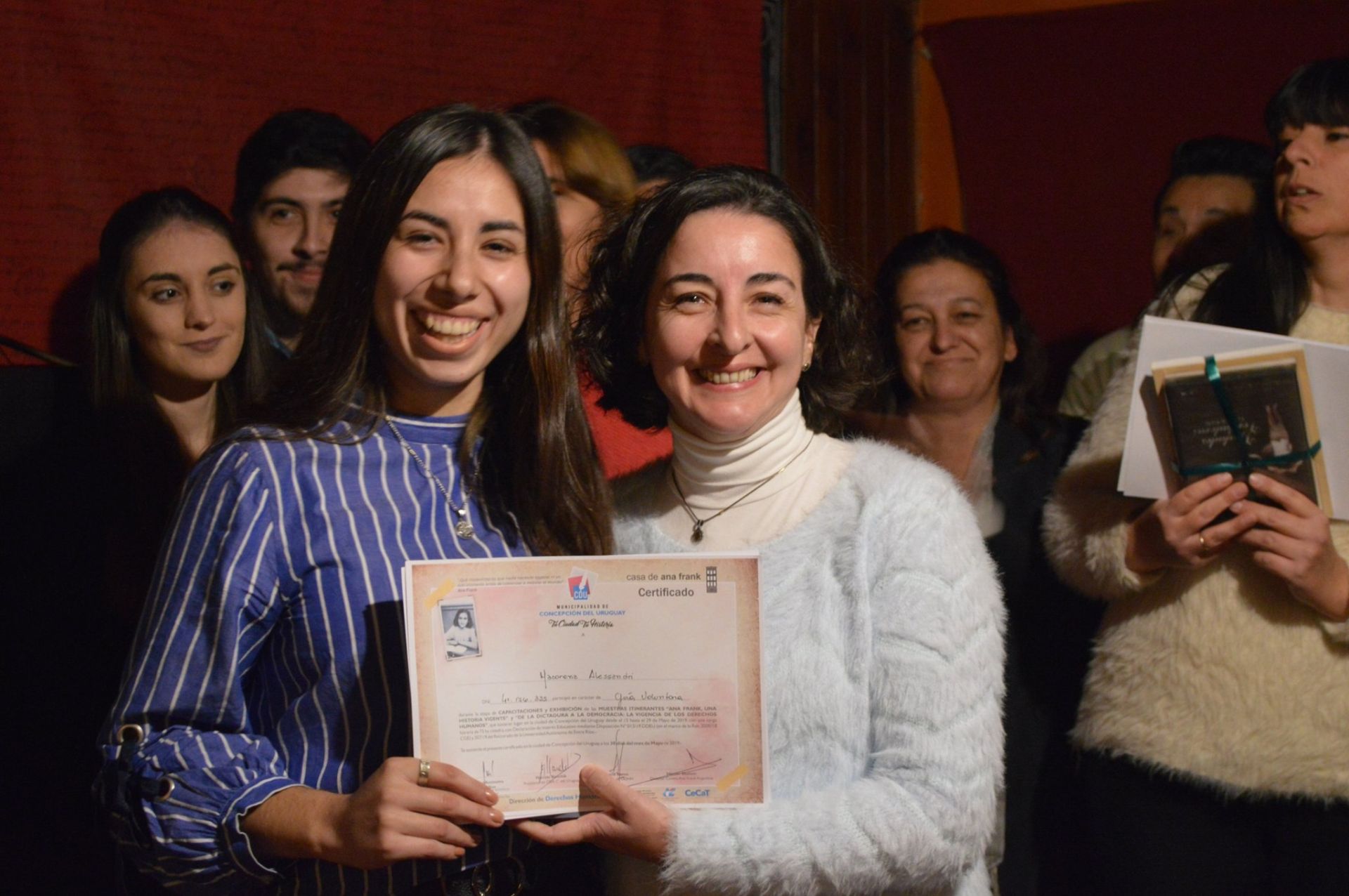 El intendente municipal José Lauritto, el Director de Derechos Humanos Darío Baron junto a otras autoridades de instituciones de la ciudad, hicieron entrega de reconocimientos al numeroso grupo de voluntarios uruguayenses que trabajaron en la muestra sobre Ana Frank, que se desarrollara hasta el pasado miércoles, en ciudad.