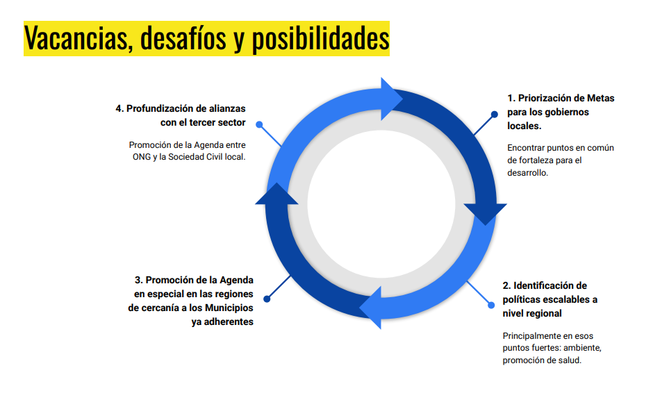 En la actualidad, 15 municipios colaboran con la Agenda 2030. Con ellos se realizó un relevamiento a cargo de la Secretaría referido a las iniciativas de política pública de nivel local que cumplen con los Objetivos de Desarrollo