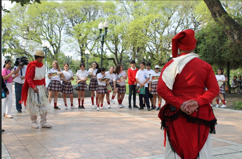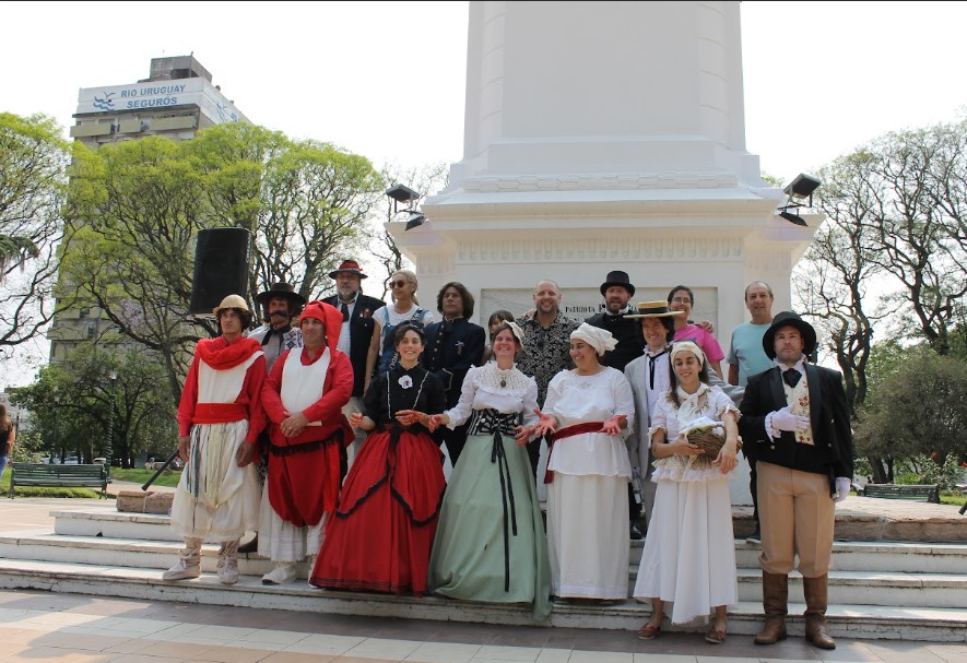 Las intervenciones urbanas, como genero artístico, no cuentan con una cuantiosa producción por fuera de las capitales, sin embargo, tras recuperarse el Encuentro Provincial de Teatro en el año 2019, en nuestra ciudad comenzó a promoverse esta innovadora modalidad escénica que tiene como escenario principal el espacio público. En esta ocasión, para evocar aquel 21 de noviembre de 1852, se invitó como público protagonista a estudiantes de nivel secundario y, tras una explicación del motivo del encuentro a cargo de Barsotti y de Pereyra respecto de la propuesta lúdica-participativa, se les entregó a cada alumno/a un álbum de figuritas que debían completar resolviendo las preguntas que este contenía. Iniciada la acción, los distintos grupos de estudiantes se convirtieron en batallones que debían dirigirse a los cantones de la defensa de la ciudad ubicados al Norte, Sur, Este y Oeste de la Plaza General Ramírez para encontrar allí las respuestas al enigma de la pieza gráfica diseñada por el mismo “Gurí” Pereyra. En cada cantón se representaba simultáneamente y de manera repetida, en loop, una escena representativa de quienes protagonizaron el combate. De esta manera, mientras que en la intersección de 25 de mayo y Galarza, el general López Jordán (Esteban Bonus junto a sus soldados Fabian Villalba y Francisco Otero) recibía el parte del capitán Gerónimo González (Fernando Disilvestro, invitado especial de la compañía San José) quien daba aviso de un vapor y siete buques de vela que navegaban río arriba prontos a invadir la ciudad; en su lado opuesto, en la intersección de San Martín y Moreno, Teófilo de Urquiza (Iván Kap) daba la orden de la organización de la resistencia en la comandancia a un soldado (Eugenio Moren) que, aún bajo los efectos de la grapa de la noche anterior, parecía que tenía moscas en el oído y estaba más preocupado por la churreasqueada del mediodía que por dar el aviso peticionado. Al mismo tiempo, en el cantón Este ubicado en la intersección de 9 de julio y Perón, se encontraban las memorables Carmen Uribe (Olivia Reinhartt) e Irene Jurado (Yésica Cañete) atendiendo junto a Teresa (Julieta Darquier) a los heridos en combate. Y, en el cantón Oeste, un maestro (Atahualpa Puchulu, actor invitado de la Compañía San José) y una lavandera (Candela Perrón) repasaban el victorioso enfrentamiento y se imaginaban que una calle en la ciudad podría llevar el nombre de “21 de noviembre” para recordar la histórica defensa. Una vez que los distintos grupos recorrieron todos los cantones, volvieron a encontrarse en la pirámide central de la Plaza. Allí, Urquiza y López Jordán se fundieron en un abrazo de triunfo tras el pronunciamiento de un pueblo que sin distinción de clase, género o edad se levantó en armas para defender no solo una ciudad, sino también el Congreso Constituyente que podía abocarse así a redactar una Carta Magna que, con actualizaciones acorde a los tiempos, nos rige hasta la fecha.