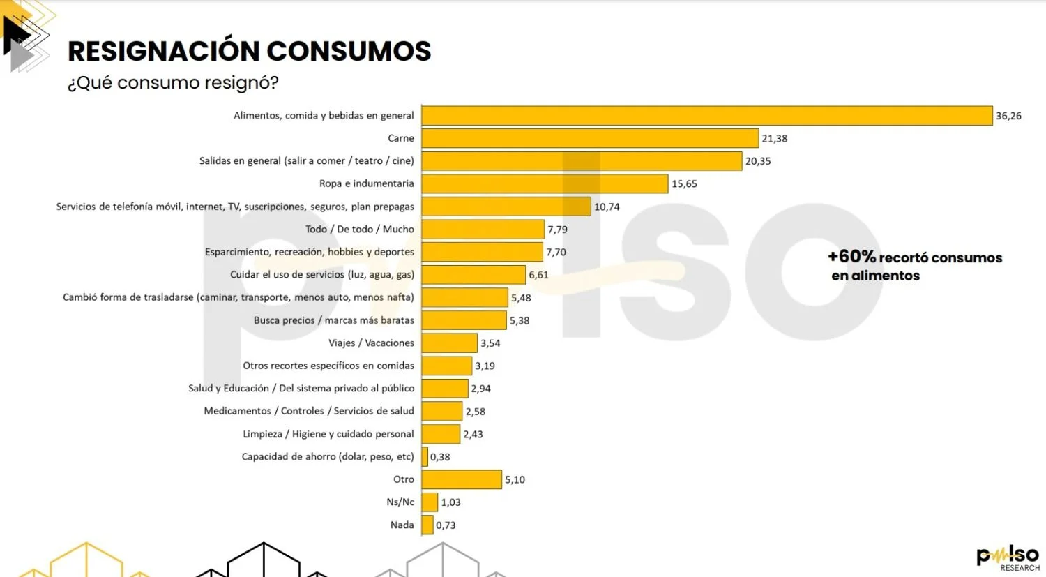 Del total de los consultados, más del 60% dijo que redujo su consumo de alimentos: el 36,26% bajó el consumo en «alimentos, comida y bebida en general», el 21,38% recortó su consumo de carne y el 3,19% hizo «otros recortes específicos en comidas».