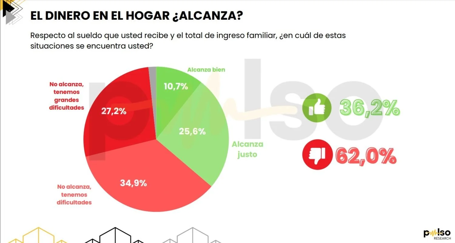 «Respecto al sueldo que usted recibe y el total de ingreso familiar, ¿en cuál de estas situaciones está usted?», dice otra de las preguntas. Allí, más del 62% dijo que «no alcanza»: el 27,2 dijo que tiene «grandes dificultades» y el 34,9% aseguró tener «dificultades». El 25,6% contestó que «alcanza justo» y al 10,7% le «alcanza bien».