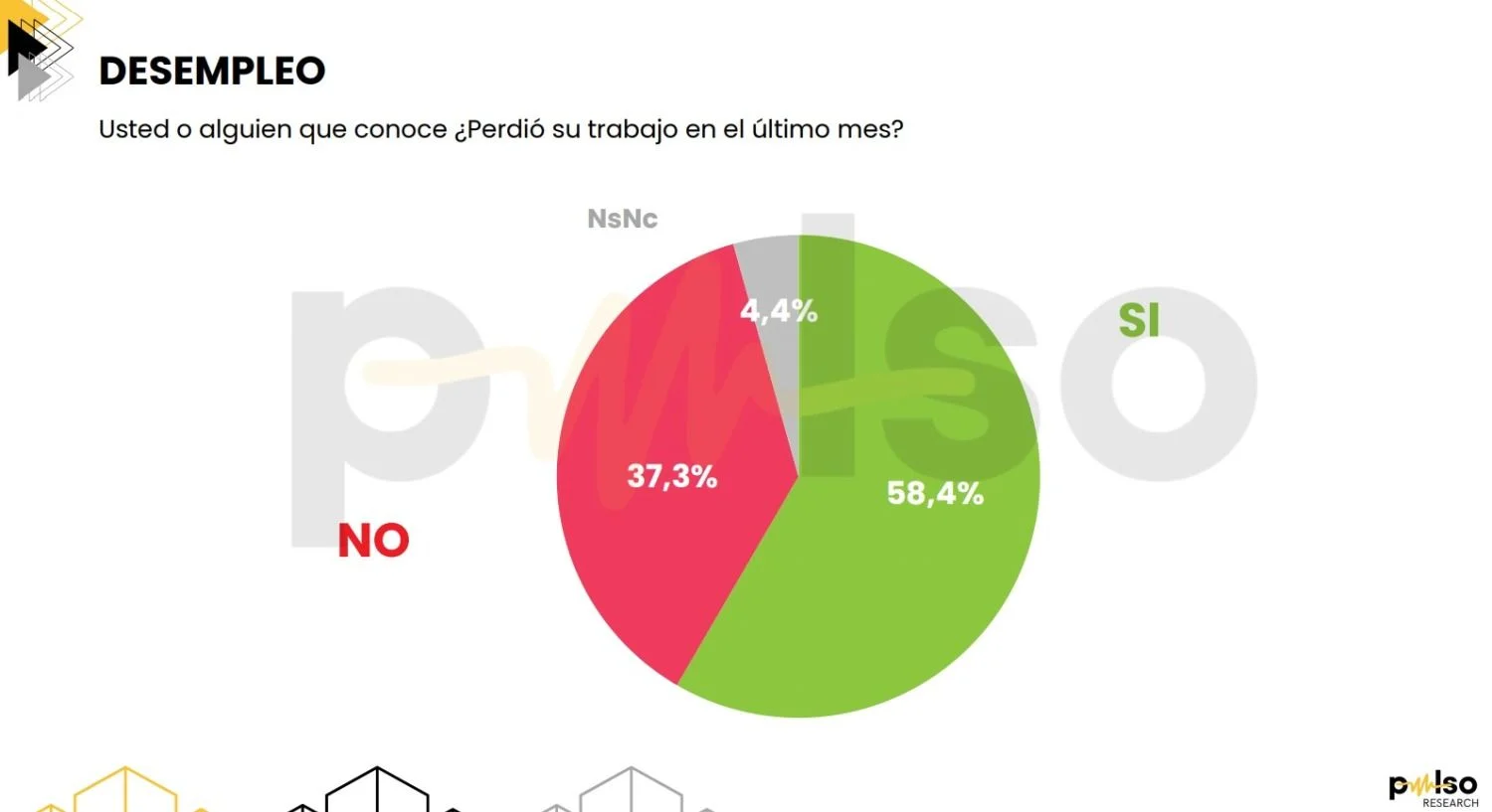 Otro de los puntos de la encuesta fue sobre el desempleo, precisamente sobre si los encuestados conocen a alguien que haya perdido su trabajo en el últim mes. Mientras el 58,4% contestó que conoce a alguien que se quedó desempleado en los últimos 30 días, el 37,3% dijo no conocer.