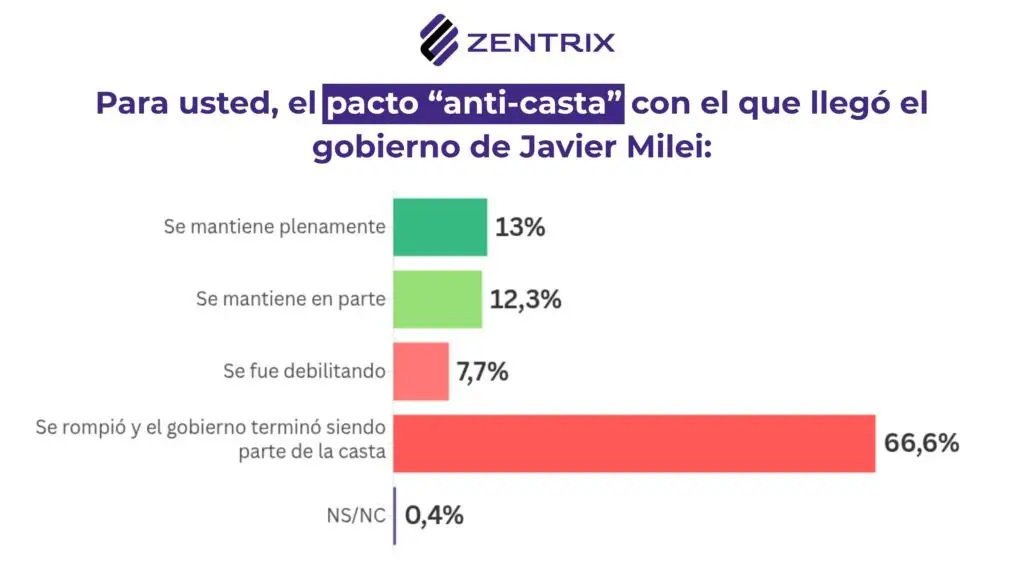 En concreto, según el relevamiento, el 66,6% de los consultados considera que el «pacto ‘anticasta'» de Milei “se rompió y el gobierno terminó siendo parte de la casta”, una cifra ampliamente mayoritaria que muestra desgaste en uno de los ejes identitarios del oficialismo.