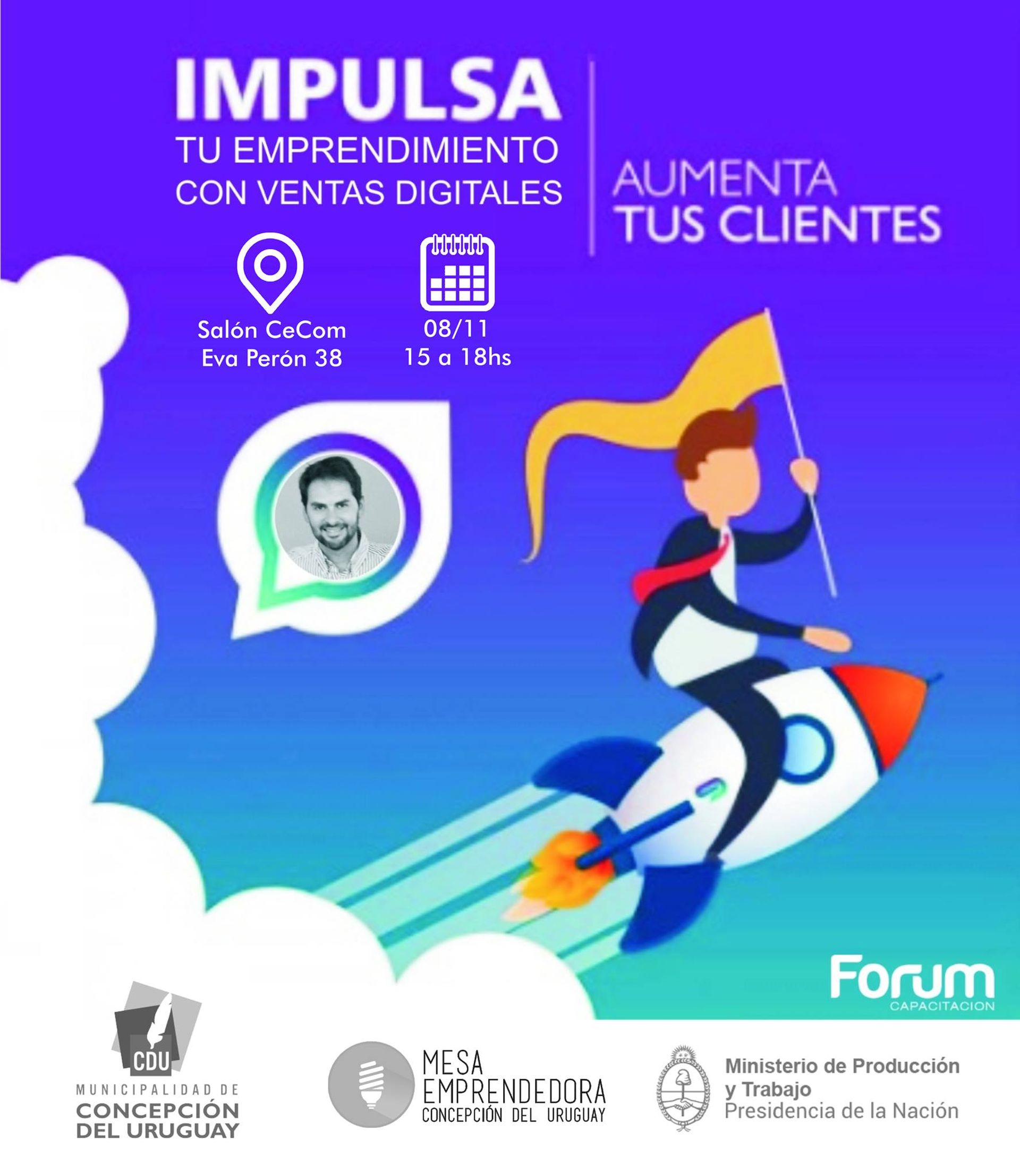 Se realizará este viernes un taller de capacitación a emprendedores, de 15 a 18 horas en el Centro Comercial. Se trata de “IMPULSA tu emprendimiento con ventas digitales y aumenta tus clientes”, que estará a cargo del Lic. Gastón Ábalos, quien es director de Forum Capacitación.