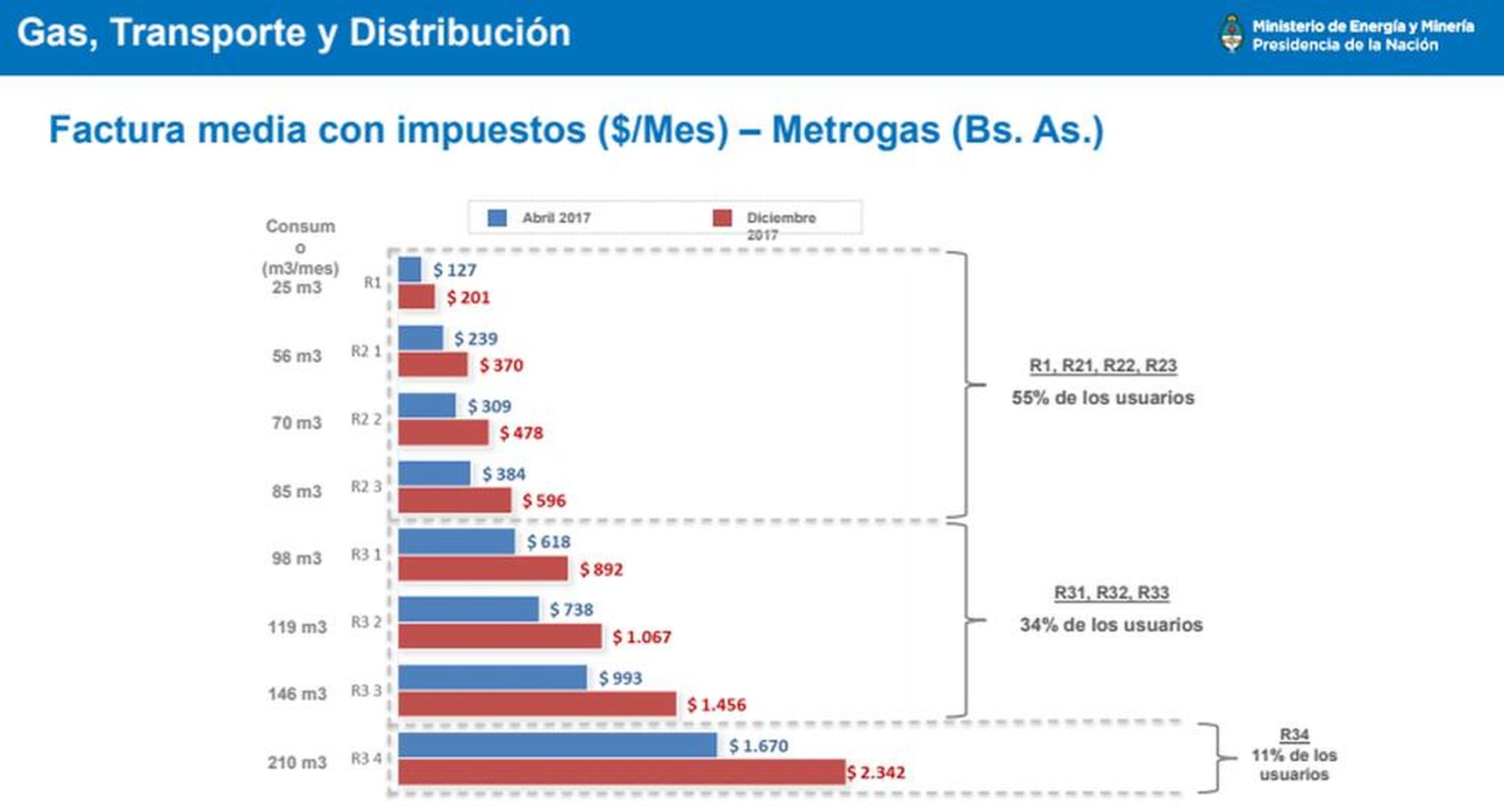 Si bien Aranguren indicó que desde este viernes «la factura media de gas aumentará 45%, ubicándose en $ 632 para el consumo medio residencial», el incremento para el 55% de los usuarios residenciales trepará al 58%. De acuerdo al nuevo cuadro tarifario presentado por Energía quienes pagaban entre $ 127 y $ 384 desde diciembre pasarán a pagar entre $ 201 y $ 596″.