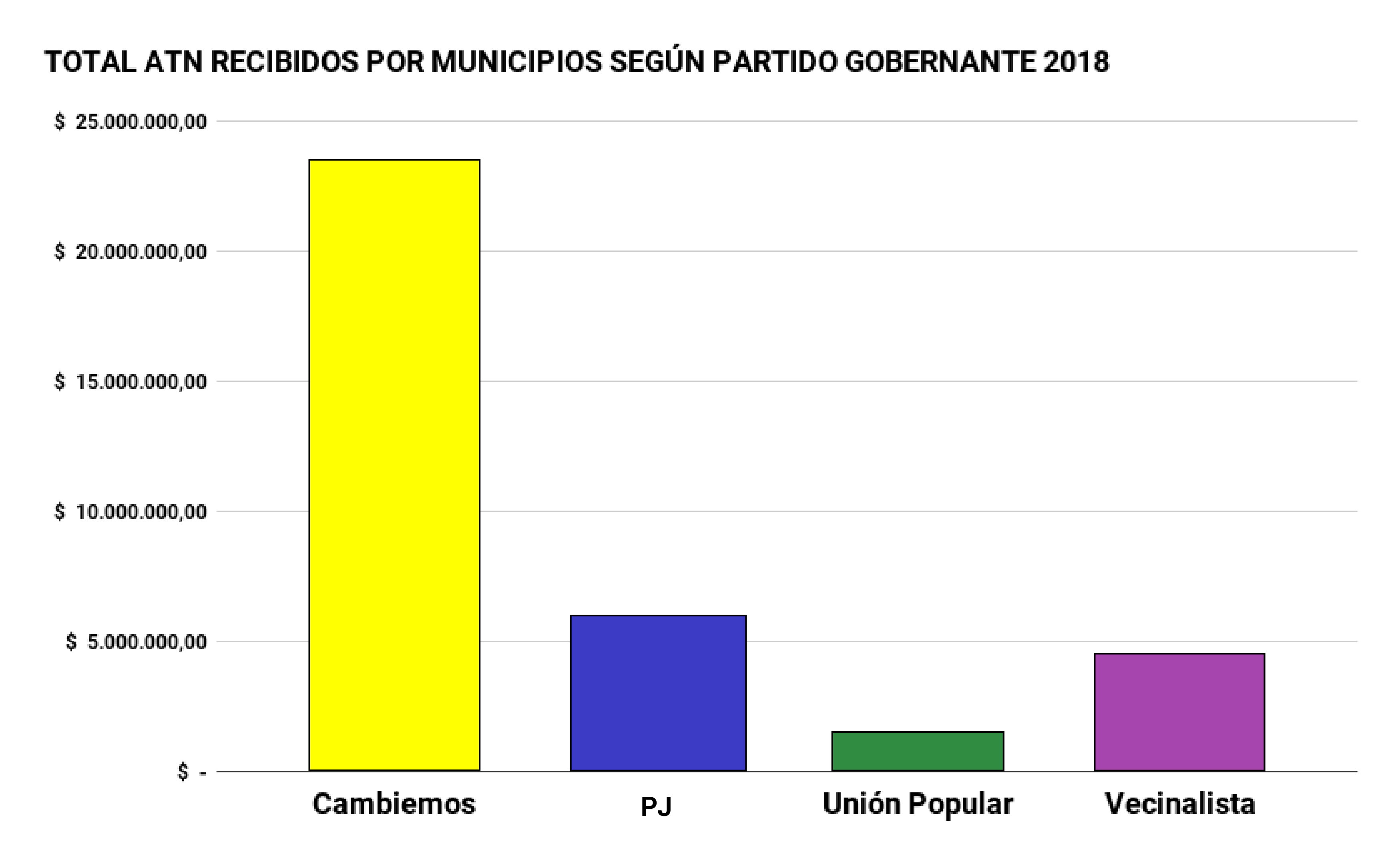Concordia, Federal, Basavilbaso, Villa Paranacito y General Ramirez encabezan el ranking de fondos enviados desde Nación. Que dos ciudades peronistas lideren esta lista es uno de los argumentos que ha tenido el ministro Frigerio para intentar desmentir la total discrecionalidad con la que se usan los ATN, argumento totalmente incoherente si observamos en detalle los números. Del total de los $248.100.000,00 que se enviaron en concepto de ATN desde 2016 hasta julio de 2018, $151.800.000,00 fueron para municipios de Cambiemos, $64.800.000,00 para el PJ, $27.500.000 a partidos vecinalistas y $4.000.000 para localidades gobernadas por Unión Popular. ¿Parece mucha diferencia, no? Quizá se observa mejor en un gráfico: