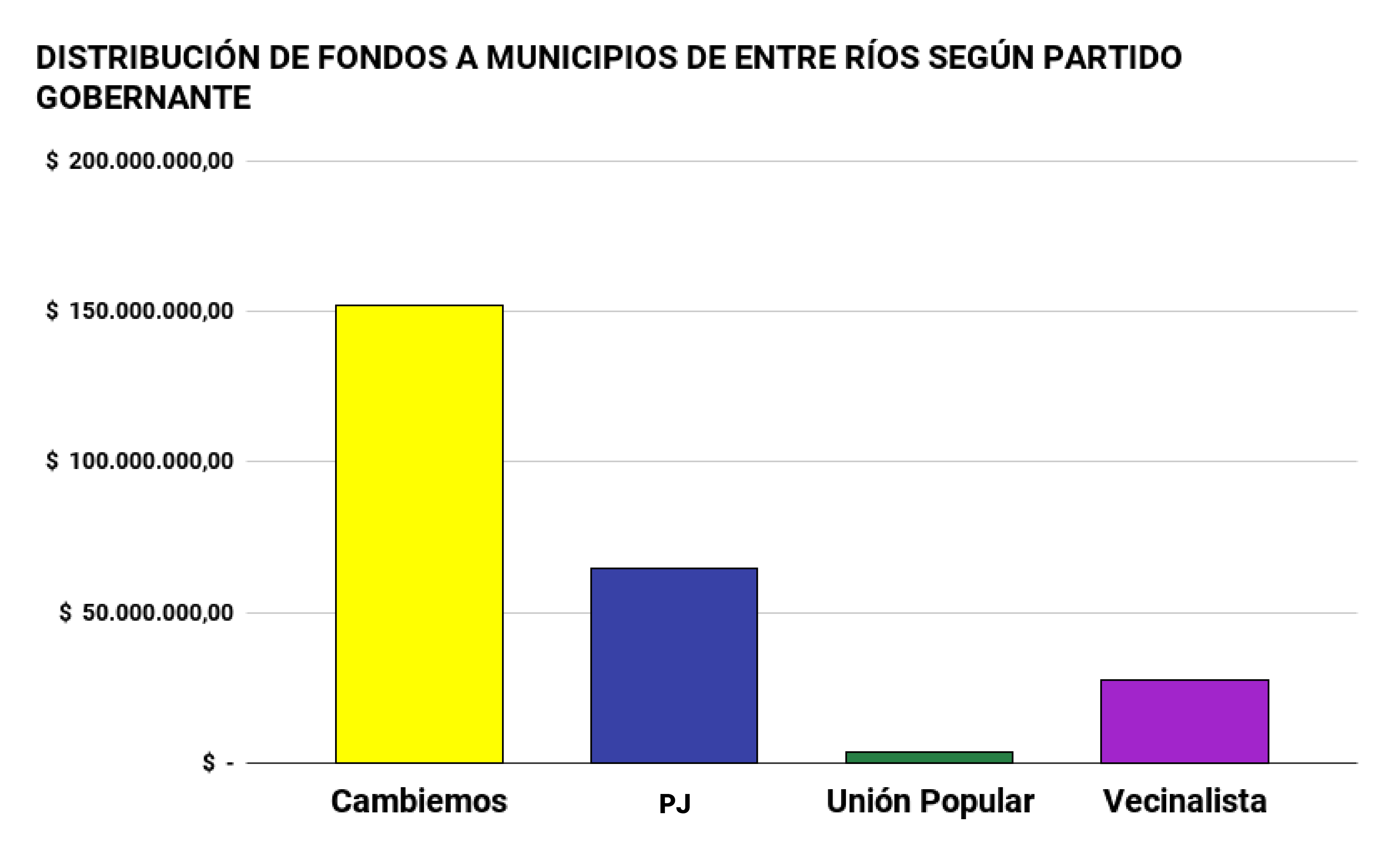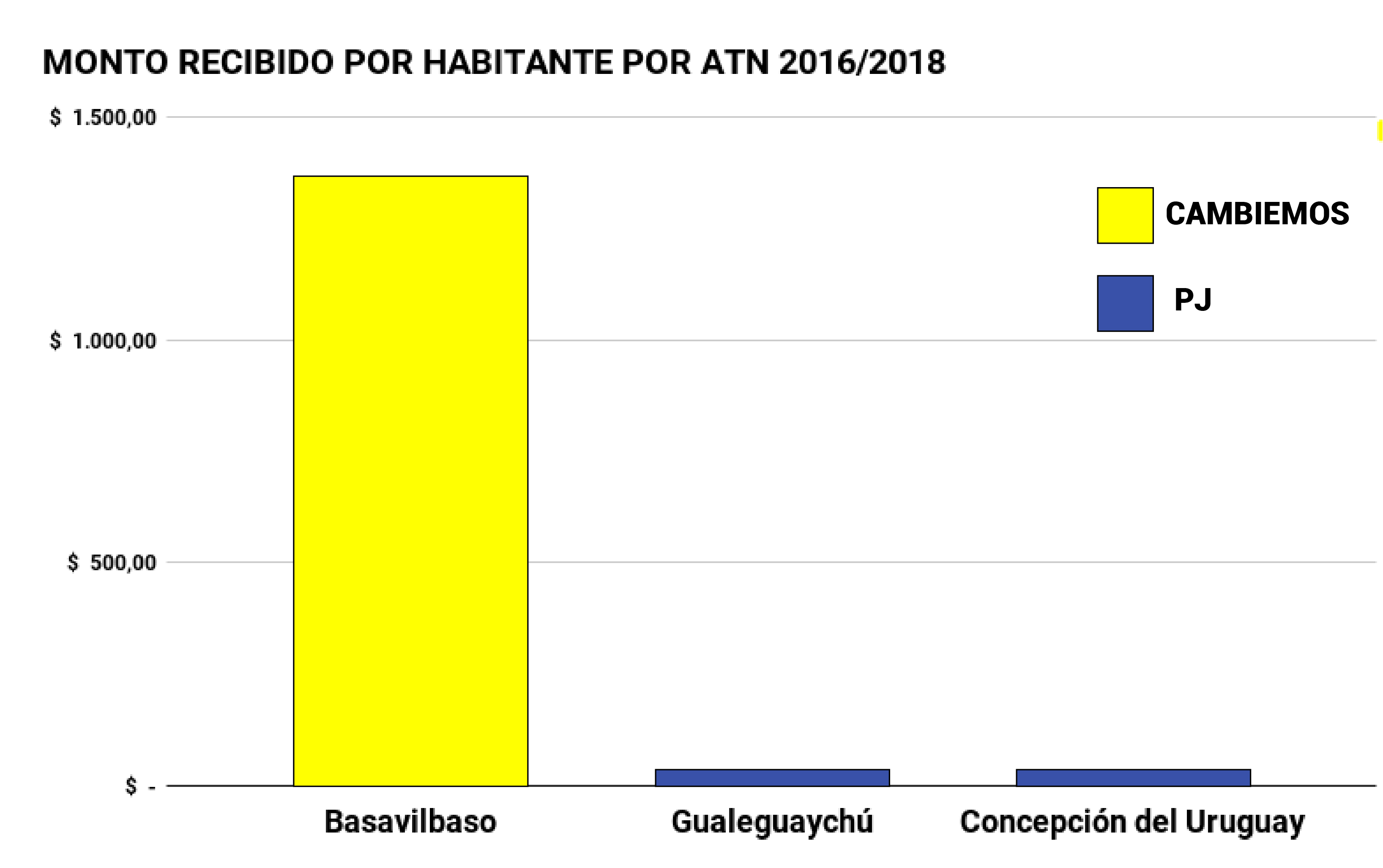 Si sumamos los fondos recibidos por Gualeguaychú y Concepción del Uruguay, dos de los municipios más grandes de la provincia que tienen intendentes del PJ, no llegan ni a la mitad ($6.000.000) de lo recibido por Basavilbaso. El cálculo de dinero por habitante deja un gráfico que habla por sí sólo. Un habitante de la localidad de “Basso”, recibió $1.365,22 cada uno, mientras que una persona que vive en Gualeguaychú recibió $30,66 y una de Concepción del Uruguay, $30,26.