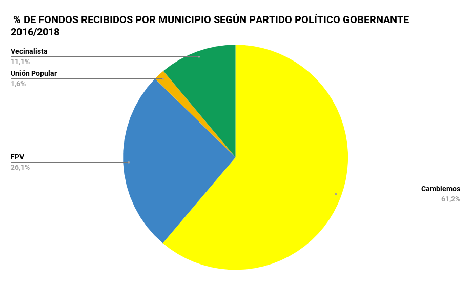 En cuanto al total de los fondos destinados a localidades amarillas, el porcentaje supera a los alevosos 61% y 60% que en 2016 y 2017 tuvieron el mismo destino. Los datos siguen llamando la atención ya que los municipios gobernados por el oficialismo nacional representan el 37% de las intendencias totales de la provincia.