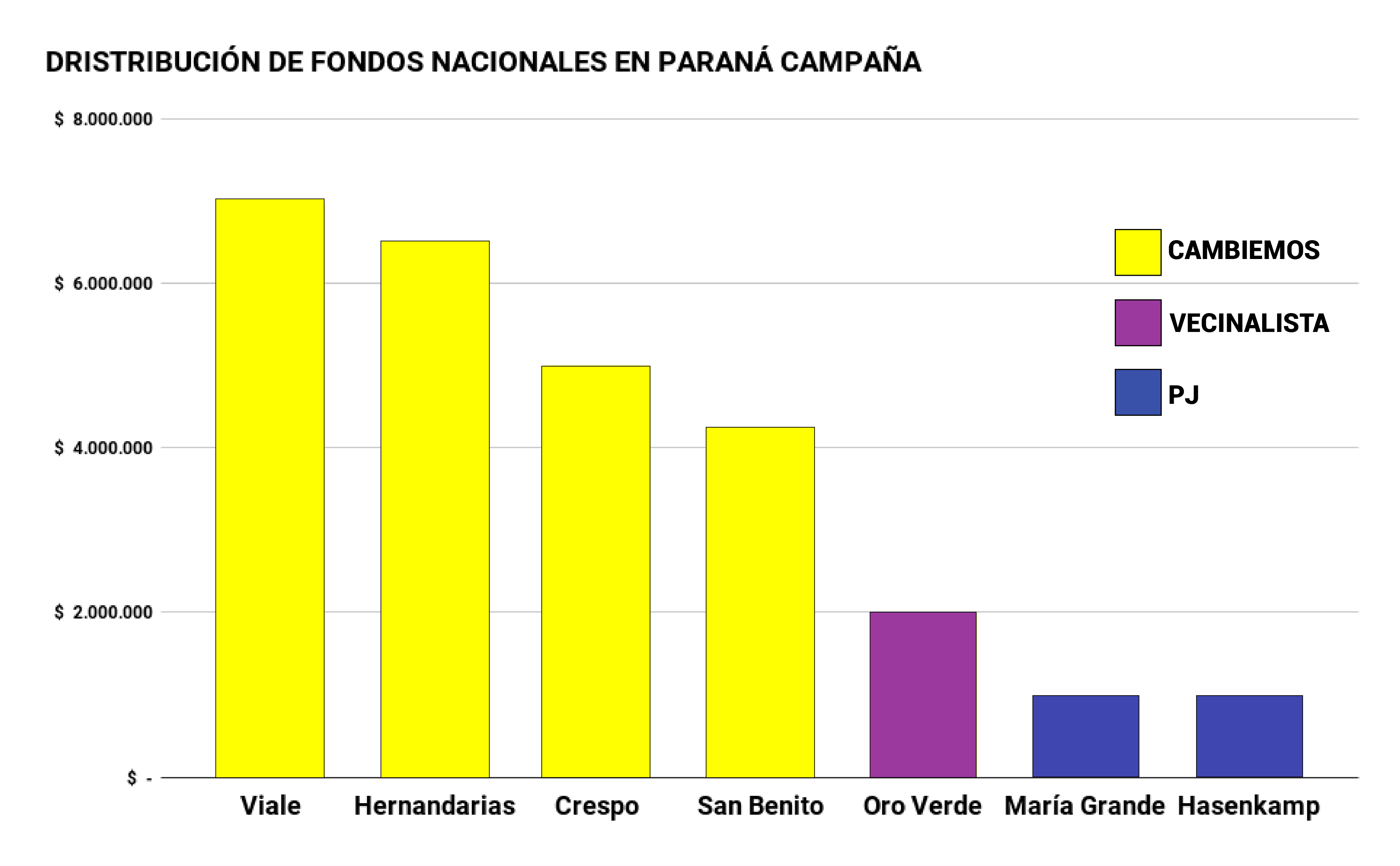 Algo similar ocurre en Parana Campaña, donde los municipios de Cambiemos recibieron desde 2016 a la fecha un total de $22.750.000, mientras que los gobernados por otros partidos suman un total de $4.000.000. Viale, una localidad de menos de $10.000 habitantes recibió $7.000.000 de parte de la cartera que conduce Rogelio Frigerio.