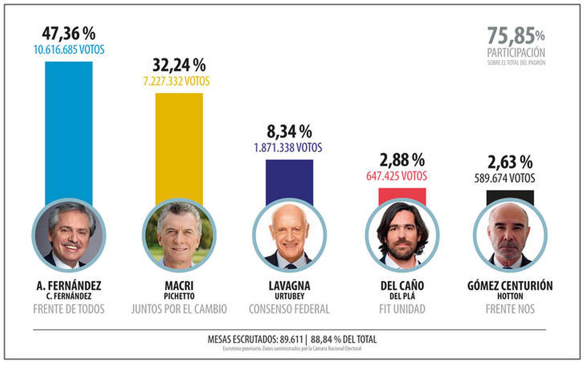 El resultado de las PASO -la primera megaencuesta nacional (real) de 2019- ubicó al candidato del Frente de Todos, Alberto Fernández, en el primer puesto con el 47,36 por ciento de los votos y relegó al oficialista Juntos por el Cambio al segundo lugar con el 32,24 por ciento de los apoyos. En un escenario hiperpolarizado, la diferencia de 15 puntos ubicaba anoche a la coalición opositora como amplia favorita para el segundo y decisivo turno electoral.