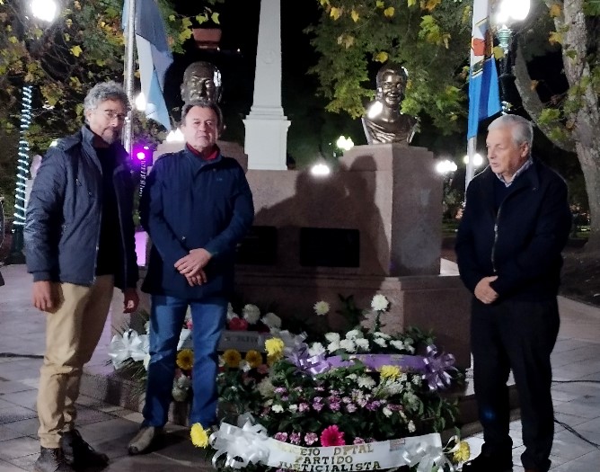 En este marco, los tres precandidatos a intendente que estarán en los cuartos oscuros estaban presentes, a saber: Marcelo Bisogni, José Eduardo Lauritto y Gabriel Perdomo. Fueron los encargados de depositar en el busto de Perón el arreglo floral en nombre del justicialismo uruguayense. Fue la primera foto de unidad de los tres desde que se presentaron las listas.