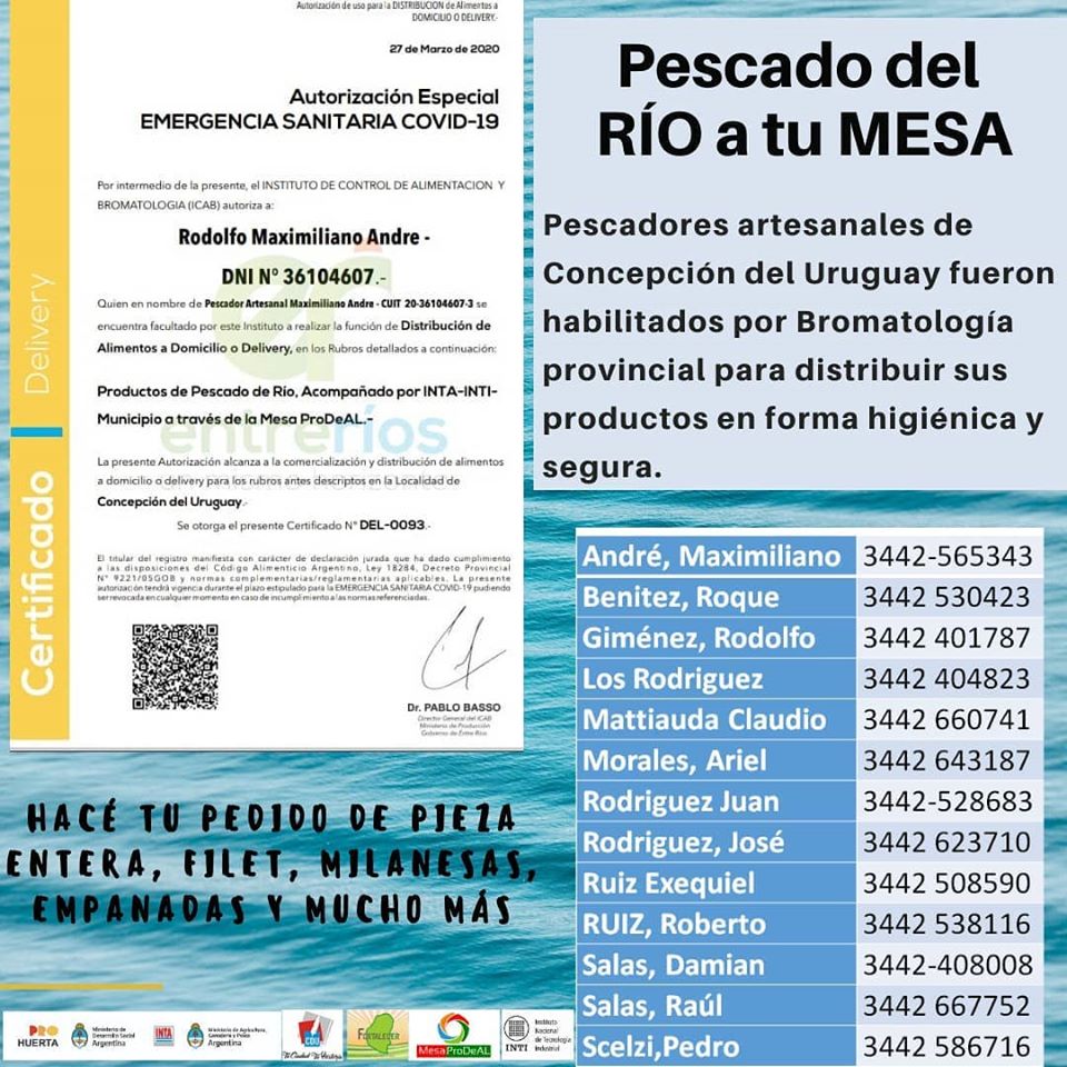 Pescadores artesanales de Concepción del Uruguay, enmarcados en un programa de mejora socio-productiva, tienen una autorización especial para realizar distribución a domicilio de pescados y sus subproductos. Habilitación que otorga el Instituto de Control de Alimentos y Bromatología de la Prov. de Entre Ríos.