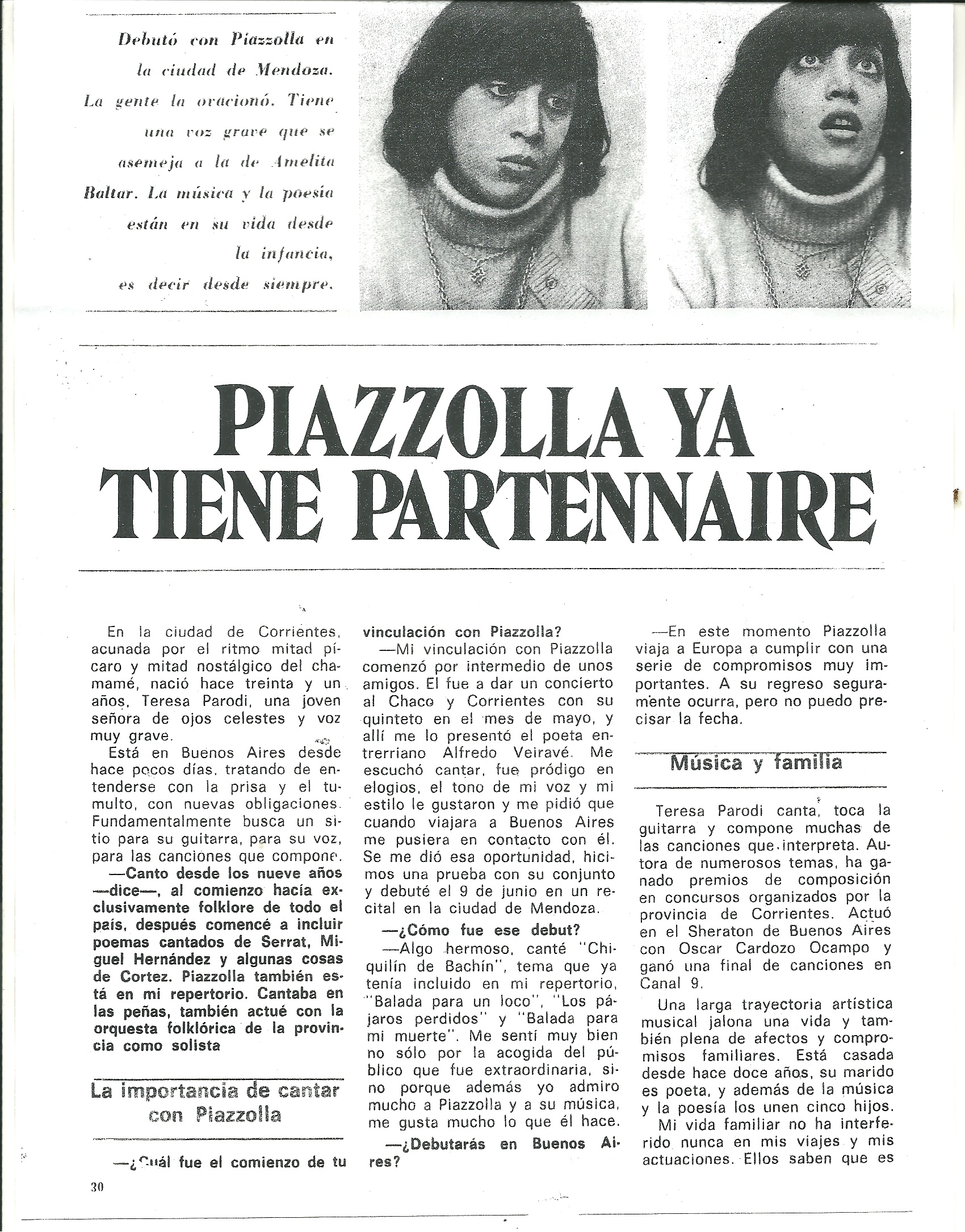 En la ciudad de Corrientes, acunada por el ritmo mitad pícaro y mitad nostálgico del chamame, nació hace treinta y un años, Teresa Parodi, una joven señora de ojos celeste y voz muy grave.