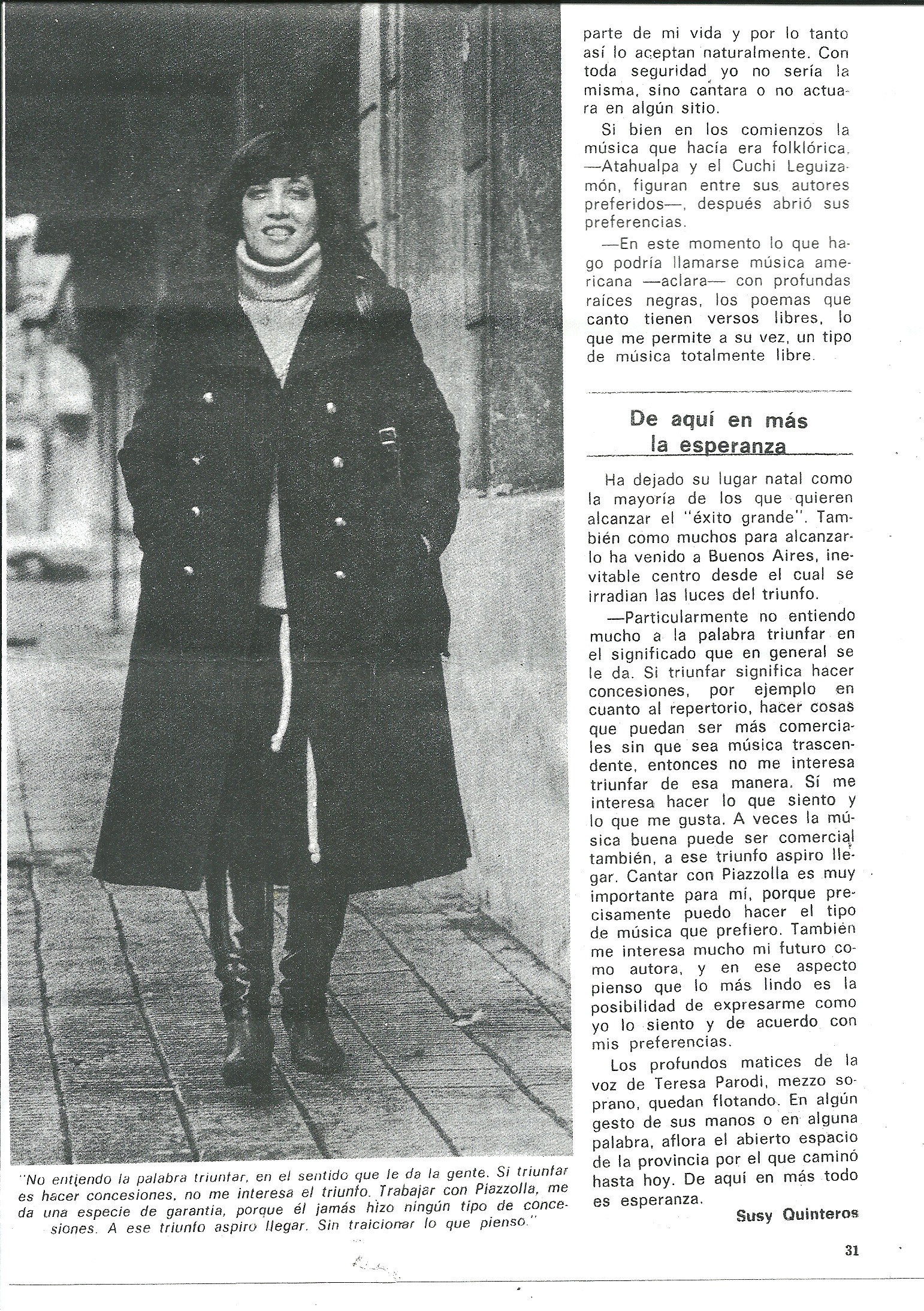 - Particularmente no entiendo mucho a la palabra triunfar en el significado que en general se le da. Si triunfar significa hacer concesiones, por ejemplo, en cuanto al repertorio, hacer cosas que puedan ser más comerciales sin que sea música trascendente, entonces no me interesa triunfar de esa manera. Si me interesa hacer lo que siento y lo que me gusta. A veces la música buena puede ser comercial también, a ese triunfo aspiro llegar. Cantar con Piazzolla es muy importante para mí, porque precisamente puedo hacer el tipo de música que prefiero. También me interesa mucho mi futuro como autora, y en ese aspecto pienso que lo más lindo es la posibilidad de expresarme como yo lo siento y de acuerdo con mis preferencias.