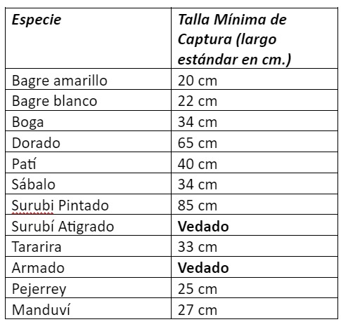 Por este motivo se recuerda al público que desarrolla actividades de pesca en aguas de la cuenca del río Uruguay, que deben respetar estrictamente la normativa acerca de las tallas mínimas de captura de las especies mencionadas en la siguiente Tabla. Individuos por debajo de esas longitudes deben ser devueltos al agua sin excepción y no pueden ser comercializados bajo ningún concepto.