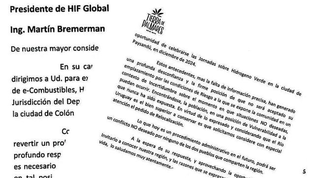 Desde la microrregión, la Municipalidad de Colón presentó -junto a una asociación ambientalista- una nota formal desde la Microrregión Tierra de Palmares dirigida al presidente de HIF Global, solicitando explícitamente la relocalización del emplazamiento actual del proyecto.