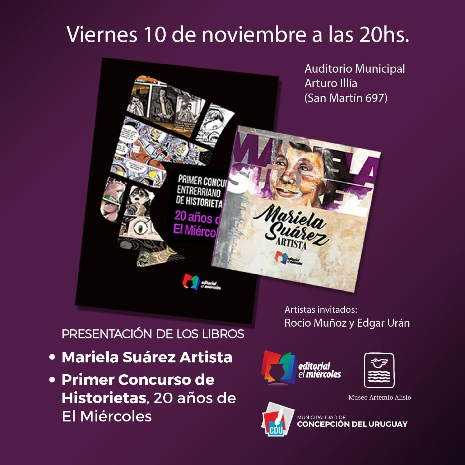 Las publicaciones “Mariela Suarez Artista” y el libro que compila los trabajos ganadores del “Primer Concurso Entrerriano de Historieta y Humor Gráfico 20 años de EL MIÉRCOLES” se presentarán este viernes 10 de noviembre en el auditorio municipal Arturo Illía a las 20hs con entrada libre y gratuita.