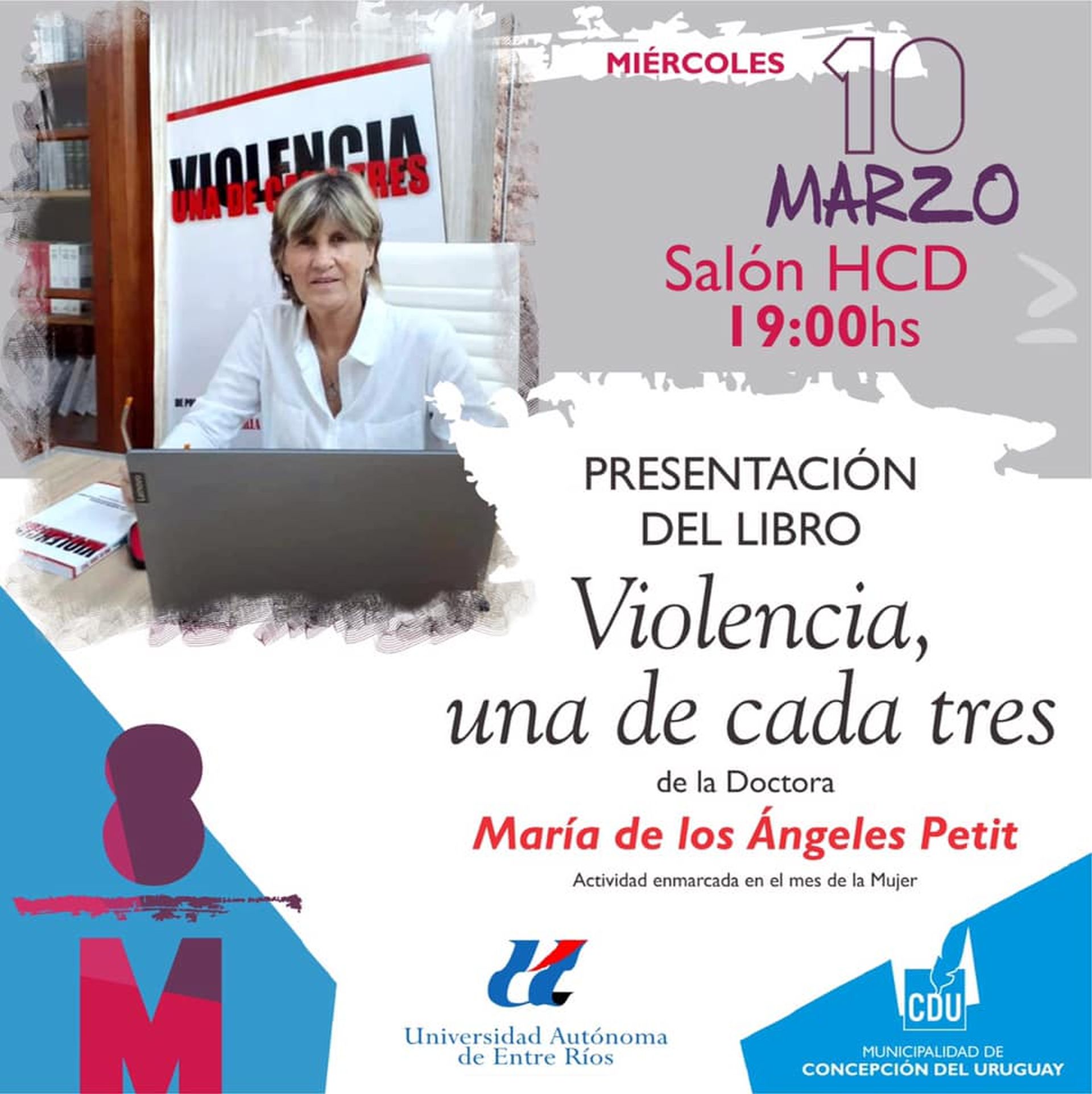 Este miércoles se llevará a cabo la presentación del libro “Violencia: una de cada tres”, escrito por la concordiense María de los Ángeles Petit. La convocatoria será este miércoles a las 19 en el Salón de Sesiones del Concejo Deliberante.