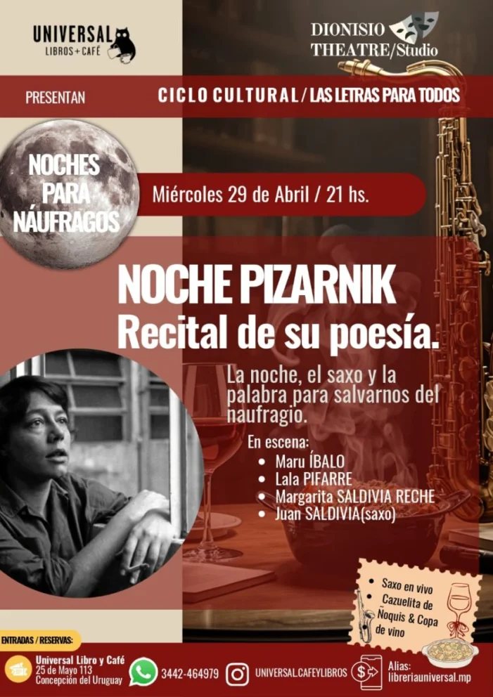 La primera cita será el miércoles 29 de abril a las 21, con “Noche Pizarnik”, un recital dedicado a la obra de Alejandra Pizarnik. La velada contará con la participación en escena de Maru Íbalo, Lala Pifarre y Margarita Saldivia Reche, junto a Juan Saldivia en saxo en vivo.