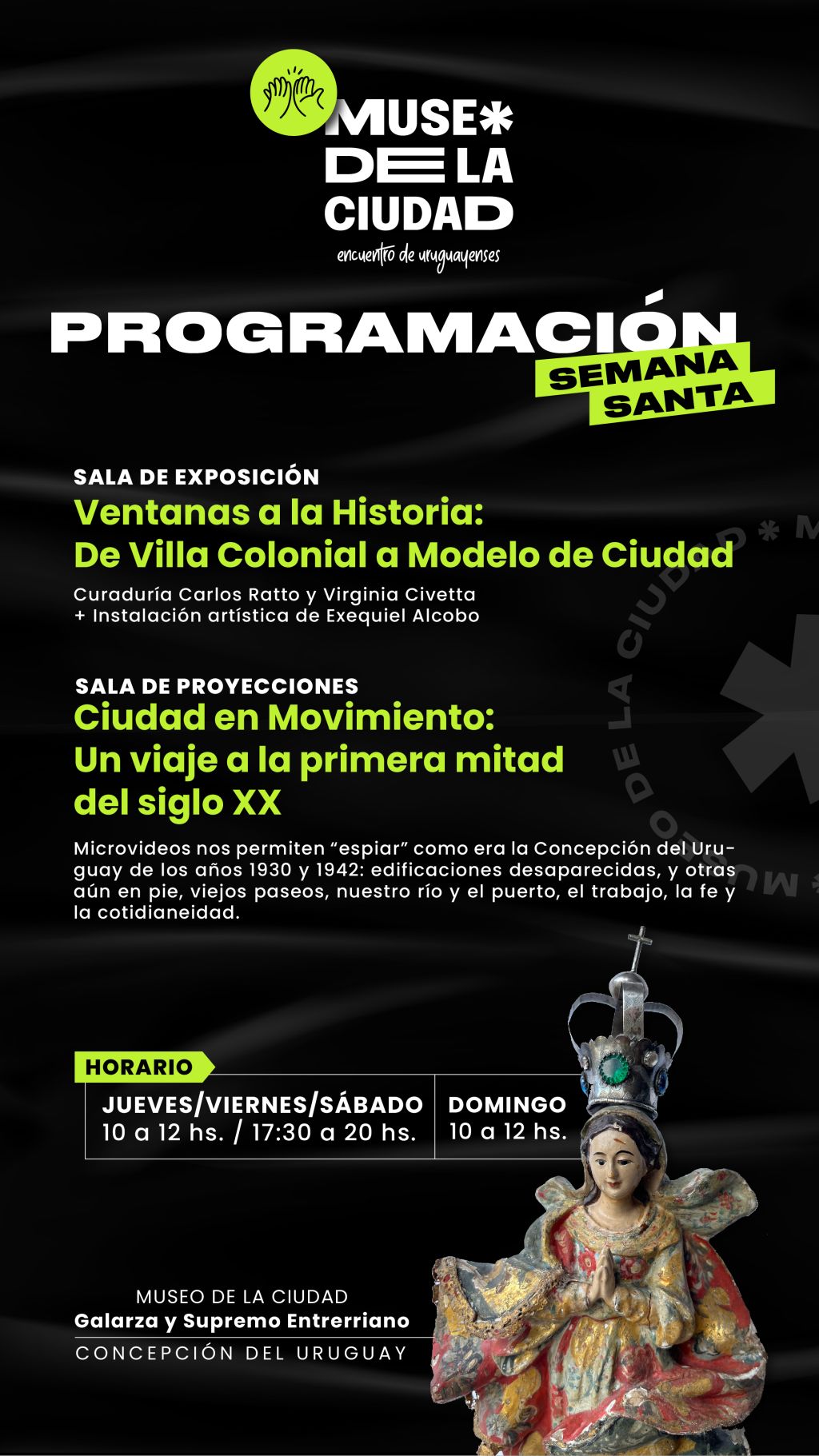 Además, excepcionalmente, en la Sala de Proyecciones del Museo, se abordará la “Ciudad en Movimiento: Un viaje a la primera mitad del siglo XX”, con un video de la Concepción del Uruguay de los años 1930 y 1942. En ellos se podrán descubrir edificaciones desaparecidas, y otras aún en pie, viejos paseos y plazas con otra configuración, nuestro río y el puerto, el trabajo de nuestros mayores, la fe y devoción popular, y la cotidianidad de la ciudad en aquellos años, con el ir y venir de los antiguos moradores.