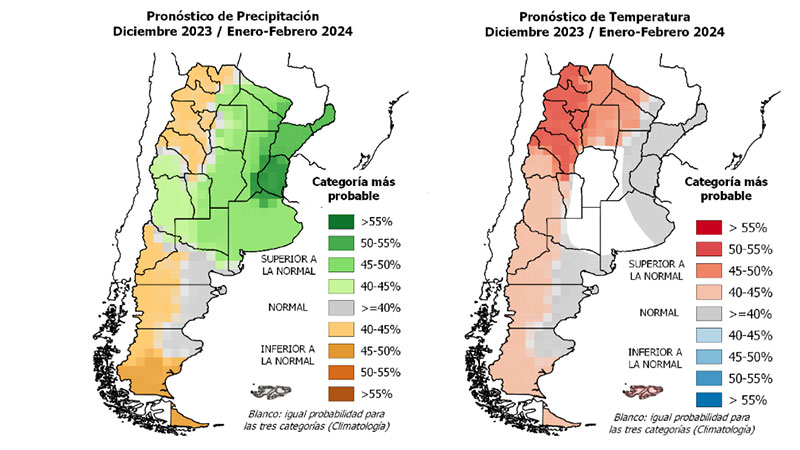 El informe al que tuvo acceso Elonce se indica que «el pronóstico de consenso para diciembre-enero-febrero», en cuanto a las precipitaciones prevé mayor probabilidad de ocurrencia de lluvias superiores a las normales sobre la región del Litoral (incluida Entre Ríos) el Norte, Córdoba, oeste de Santa Fe, este de San Luis, este de La Pampa y Buenos Aires..