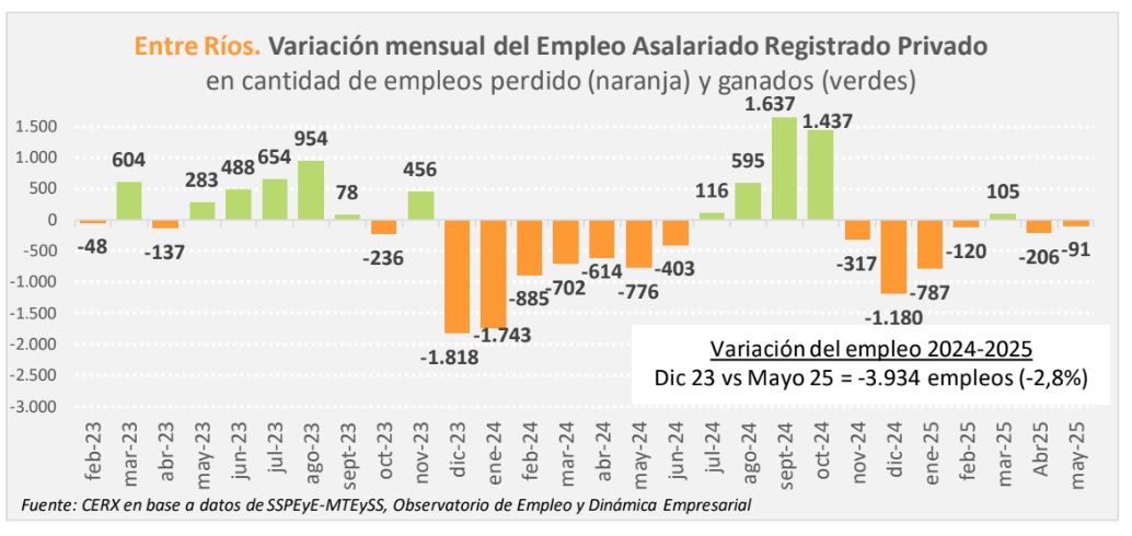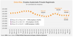 Bajo el título “El empleo privado en Entre Ríos mejora por segundo mes consecutivo en mayo. Creció 0,6% frente a mayo 2024. Son casi 800 empleos más que un año atrás. Pero aún no alcanza para recuperar los casi 4000 puestos perdidos en los últimos 17 meses.”
