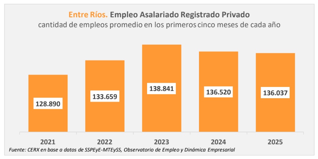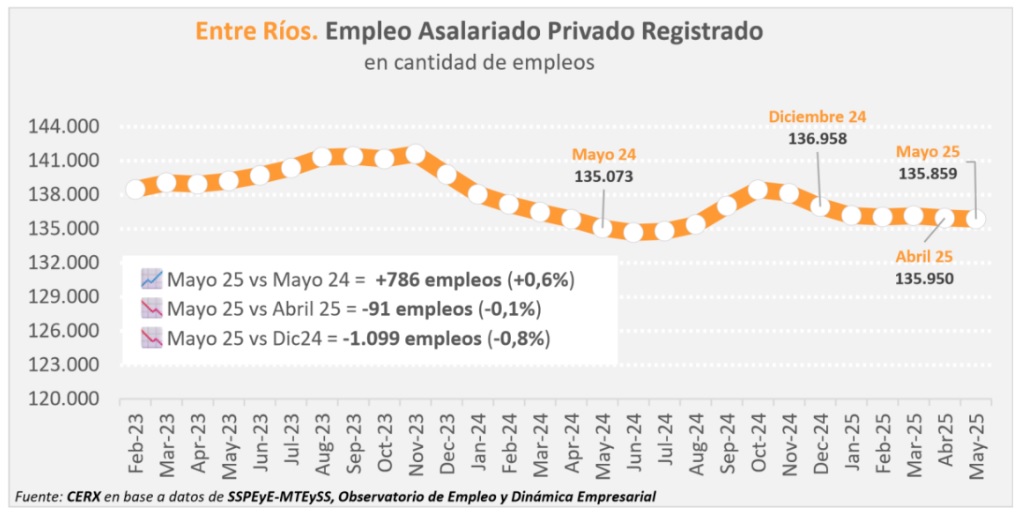 - Los datos de mayo confirman que el empleo privado en Entre Ríos comenzó a dar señales de recuperación, pero todavía no logra revertir el retroceso acumulado desde fines de 2023.
