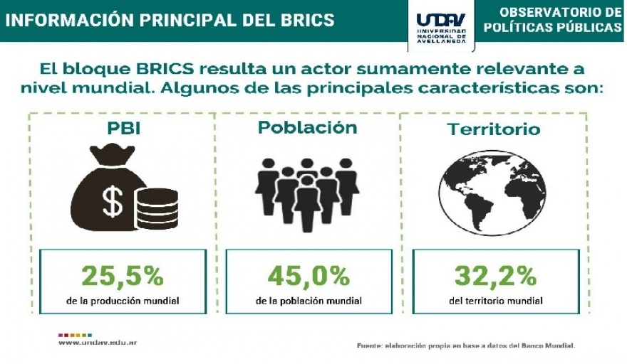 Desde el año 2006, Brasil, Rusia, India y China vienen trabajando en conjunto para fortalecer su posición como economías emergentes y aumentar su protagonismo en el plano internacional. En el año2010, se aprobó la incorporación de Sudáfrica al grupo, expandiendo el bloque y consolidando el paradigma de cooperación sur-sur. La novedad más reciente fue la incorporación de 6países a partir del primero de enero de 2024. Estos países son Argentina, Egipto, Irán, Emiratos Árabes Unidos, Arabia Saudita y Etiopía. Con la incorporación de estos nuevos países, el bloque pasa a representar el 25,5% del PBI mundial. En cuanto a los datos demográficos, la población de los BRICS representa el 45% de la población mundial.