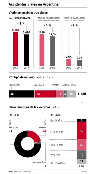 Hubo más víctimas en el ámbito urbano (58%) que en el rural (41%). Sin embargo, los accidentes en las rutas son especialmente riesgosos: “cuando chocan de frente, se mueren todos”, sostuvieron. Contra eso, desde el Gobierno apuntan a tres ejes: la construcción de autopistas (hay 1.216 kilómetros en proceso), la creación de variantes (para que las rutas no atraviesen ciudades) y la implementación de rutas seguras (con carriles de sobrepaso y banquinas pavimentadas).
