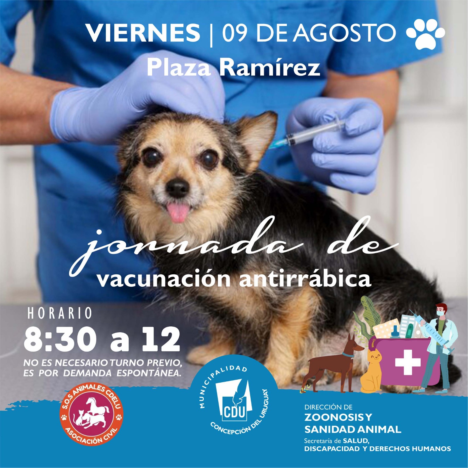Desde la Secretaría de Salud, Discapacidad y Derechos Humanos, a través de la Dirección de Zoonosis y Sanidad Animal, la Municipalidad de Concepción del Uruguay llevará adelante una jornada de vacunación antirrábica para perros y gatos. La misma tendrá lugar en Plaza Ramírez este viernes 9 de agosto entre las 08:30 y las 12:00 horas.