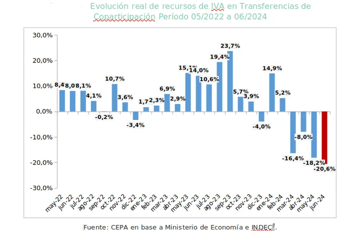“Los últimos cuatro meses exhibieron un derrumbe (del IVA) explicado por la fuerte caída de la actividad económica y del consumo. Esto podría estar asociado a que la suba del IVA aduanero no logra compensar el desplome del IVA interno. En 2023 todos los meses habían exhibido subas en términos reales mientras que este año la recaudación cayó en cuatro de los seis meses”, indica el reporte.