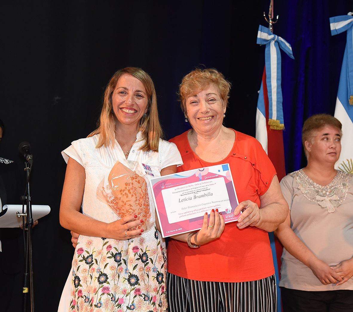 A propuesta de las instituciones y organizaciones, fueron homenajeadas: Leticia Brambilla por el Taller de Estimulación Cognitiva “Neuronas en Acción”, Adriana Aparicio y Nancy Bitenberg por la Asociación Civil Aportar, Griselda Acevedo por el SUM de Cantera 25, Lucía Ibarra por Casa del Niño San Roque, Teresita Pepe por Santa Clara de Asís, Patricia Saldarelli por Surco de Esperanza, Norma Ogguier por la Asociación de Periodistas, María de los Ángeles Monroy a propuesta de la Comisaría de Minoridad y Violencia Familiar, Claudia Peralta por ALCEC, Marina Bofelli por la Policía de Entre Ríos, Verónica Bulay Valdunciel representando a ATE/CTA, Inés Alves por la Fundación Micaela García, Yanina Zugnoni a propuesta de MTE, Rocío Frías por Gendarmería, Ramona Sanabria por la Fundación de Ayuda a las Mujeres Golpeadas, Paula Pereyra en representación del Batallón de Ingenieros Blindados 2, María Belén Basgall y Fernanda Barragán por los Bomberos Voluntarios, y Gladys Vouilloud por el Cecom. Asimismo, la Dirección de Mujeres, Géneros y Diversidad realizó un homenaje postmortem a la reconocida Mara Pérez, quien fue representada por su hija. Mara fue una intensa luchadora desde hace más de 25 años por los derechos de igualdad y respeto hacia las mujeres, llegando a conformar una Asociación denominada “Mujeres en Acción”.