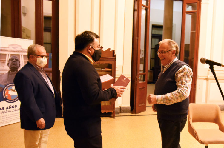 El acto tuvo lugar en el hall de Escuela Normal y durante su transcurso el presidente municipal Martín Oliva, acompañado del director de LT 11 Juan Antonio Izaguirre y del coordinador General de Cultura, Turismo y Deporte Martín Merlo, hizo entrega al homenajeado de la edición de tres tomos que integran “La Historia de Concepción del Uruguay”, escrita por el profesor Oscar F. Urquiza Almandoz.