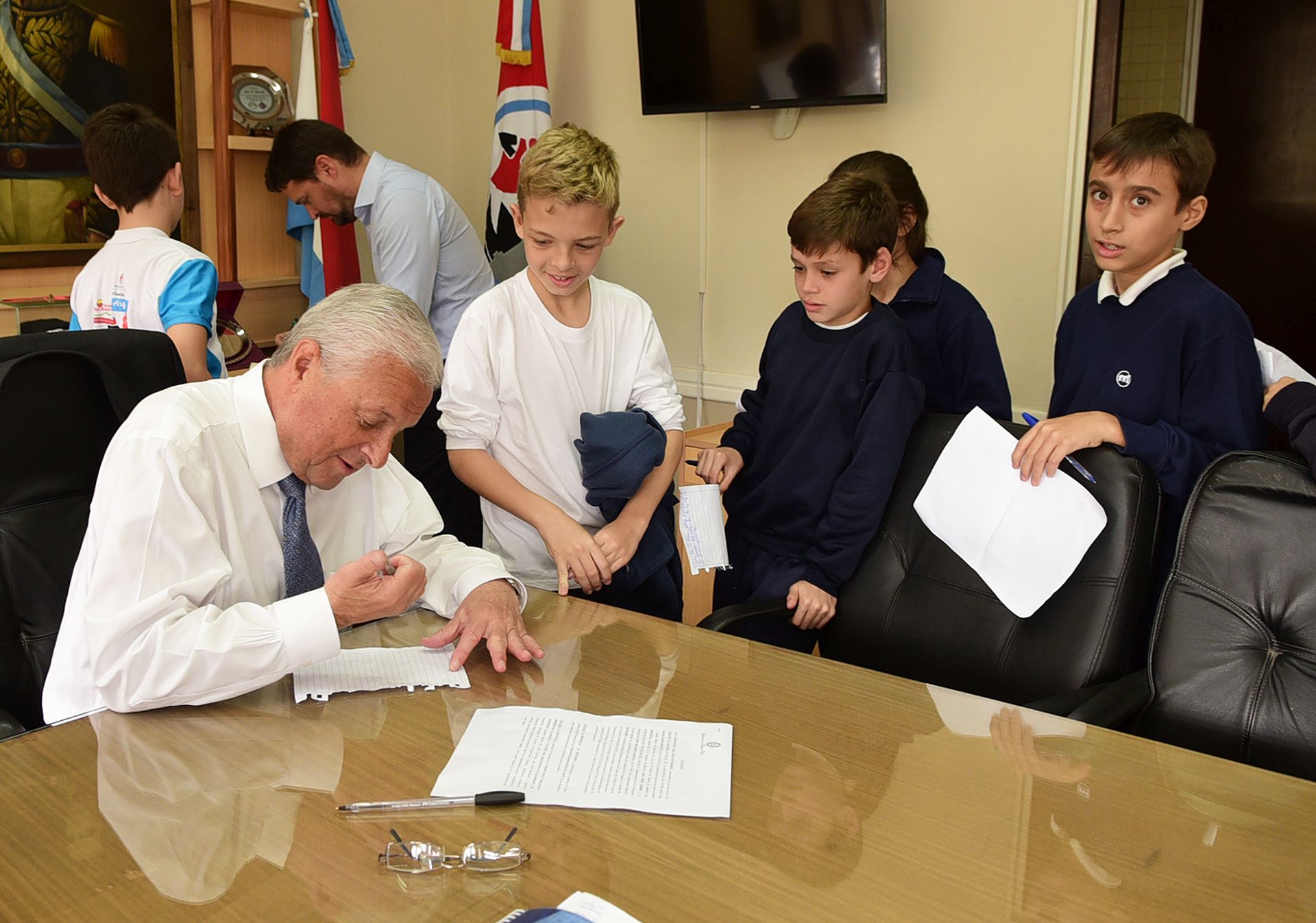 De esta manera, los chicos pudieron hacer preguntas a concejales, funcionarios y al mismo Intendente, que hizo un alto en las tareas del día para compartir unos minutos con los alumnos. Finalmente se le entregó como obsequio a la Escuela una bandera argentina para el mástil.
