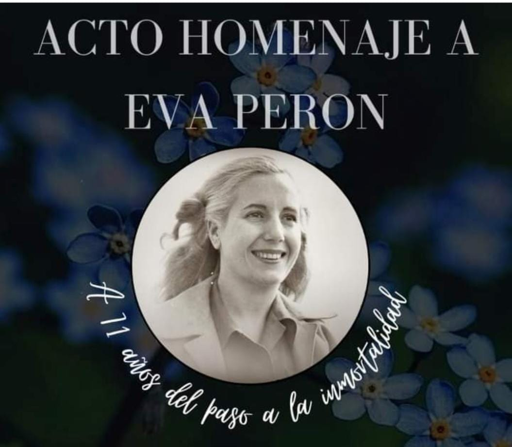 El Consejo Departamental del Partido Justicialista (PJ) realizará hoy el homenaje a María Eva Duarte de Perón, ‘Evita’, al cumplirse 71 años de su paso a la inmortalidad. Será a las 20:00, ante los bustos de Perón y Evita de plaza Ramírez.