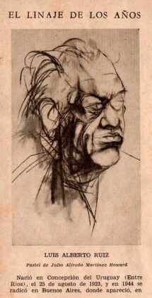 Una biografía nos cuenta que Luis Alberto Ruiz, nació en Concepción del Uruguay el 18 de septiembre de 1923 y murió en Buenos Aires, en 1987. Fue poeta, narrador, ensayista y periodista. En Buenos Aires ofició de asesor literario, corrector, traductor, compilador, prologuista, lector y autor de Claridad, donde publicó el poemario “La pasión que nos salva”, entre otras. Fue asiduo colaborador de los principales diarios del país, entre ellos el innovador “La Opinión” de Jacobo Timerman. Años antes, en su ciudad natal participó de la fundación del Diario La Calle junto al también poeta Alfredo Martínez Horward, Leopoldo Broeld y otros. A su vez colaboró en la mayoría de los periódicos locales.