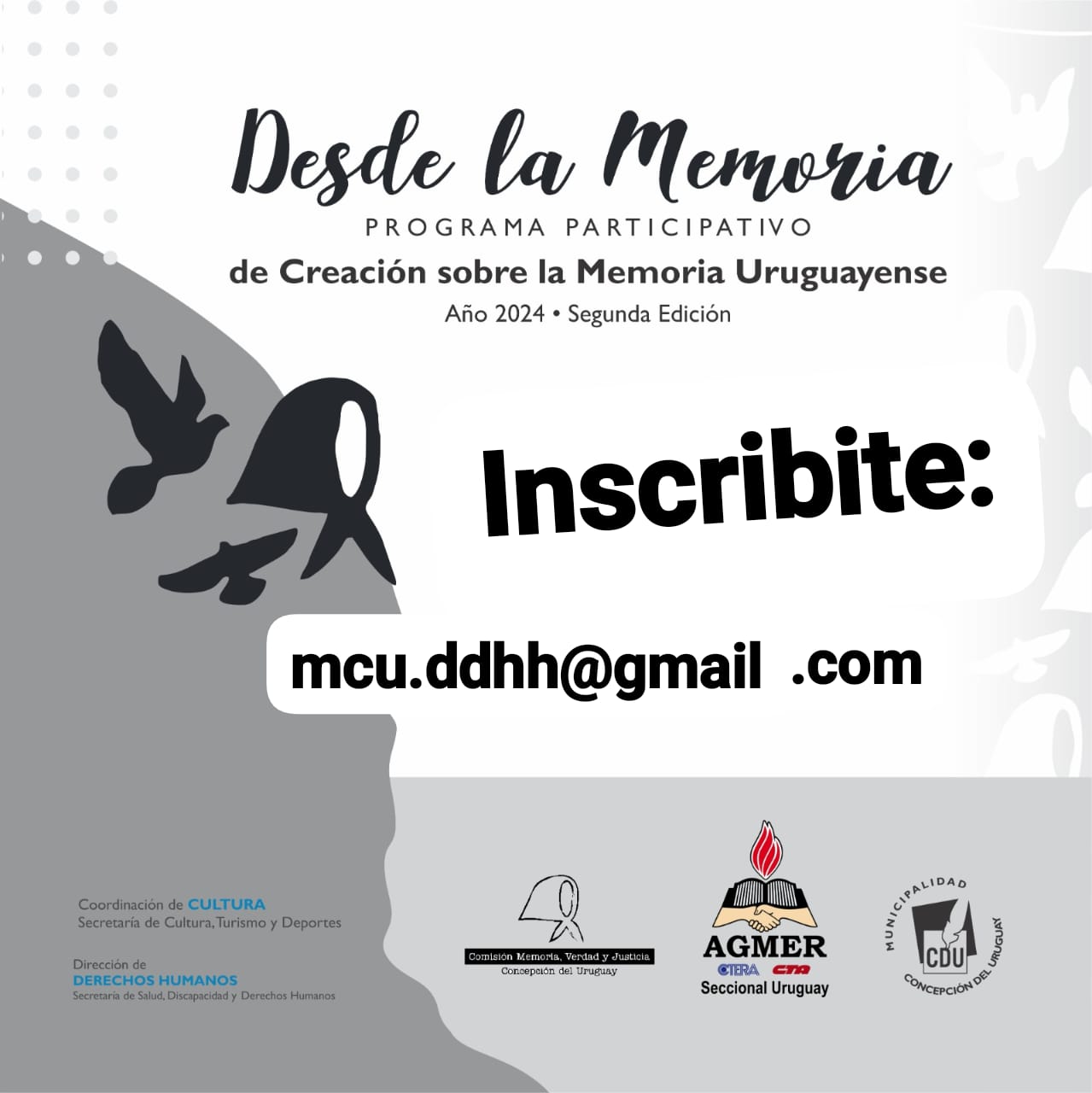 Continúa la inscripción para ser parte del Programa Participativo “Desde la Memoria”, en el cual interviene la Dirección de Derechos Humanos de la Municipalidad junto a la Coordinación de Cultura, la Asociación Gremial del Magisterio de Entre Ríos (AGMER) y la Comisión Memoria, Verdad y Justicia de Concepción del Uruguay.